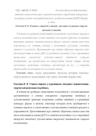 - Рагозіна, Вікторія Валентинівна (orcid.org/0000-0002-3694-2054) (2016) Learning art from the artists: a method for artistic creative activity of a child Мистецтво та освіта, 1 (79). pp. 24-30. ISSN 2308-8885