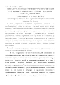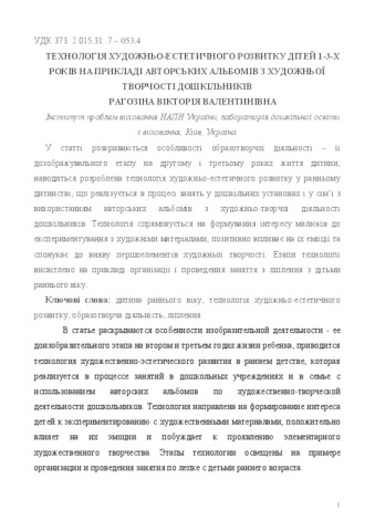 - Рагозіна, Вікторія Валентинівна (orcid.org/0000-0002-3694-2054) (2016) Technology of artistic and aesthetic development of children 1-3 years on the example of the author's albums of artis Митець – культура – виміри часу. Міжнародні наукові читання 2016 в Музеї Бориса Лтошинського в Житомирі. pp. 205-217.