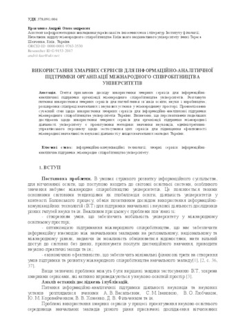 - Кравченко, А.О. (orcid.org/0000-0001-9763-3530) (2017) The usage of cloud services for information and analytical support of the international cooperation organization of universities Інформаційні технології і засоби навчання, 5 (61). pp. 261-275. ISSN 2076-8184