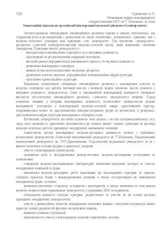- Кравченко, А.О. (orcid.org/0000-0001-9763-3530) (2017) Innovative approaches to organization of international scientific activity of the university In: Звітна наукова конференція Інституту інформаційних технологій і засобів навчання НАПН України : Збірник матеріалів наукової конференції . Інститут інформаційних технологій і засобів навчання НАПН України, м. Київ, Україна, pp. 158-160.