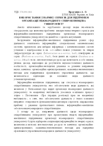 - Кравченко, А.О. (orcid.org/0000-0001-9763-3530) (2017) Use of cloud services to support the organization of international cooperation of the university In: Науково-практична конференція «Мультимедійні технології в освіті та інших сферах діяльності» . НАУ, м. Київ, Україна, pp. 41-42.