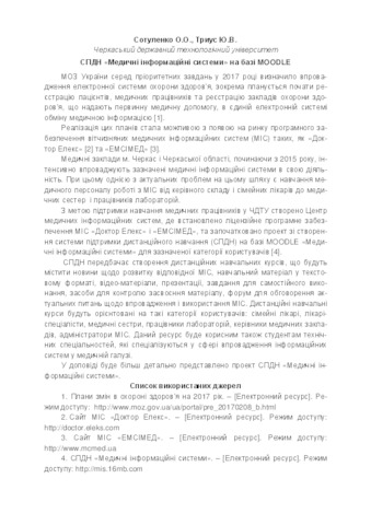 - Триус, Ю.В. and Сотуленко, О.О. (2017) Creation of a system of support of distance learning "Medical information systems" based on MOODLE In: П’ята міжнародна науково-практична конференція «MoodleMoot Ukraine 2017. Теорія і практика використання системи управління навчанням Moodle» . Київський національний університет будівництва і архітектури, м. Київ, Україна, p. 24.