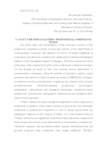 - Бородієнко, О.В. (2017) T. Saaty's method in directors' professional competence design Наука і освіта, 6. pp. 167-172. ISSN 2311-8466