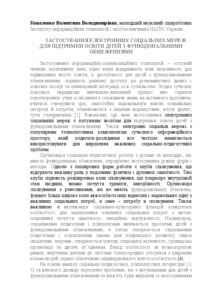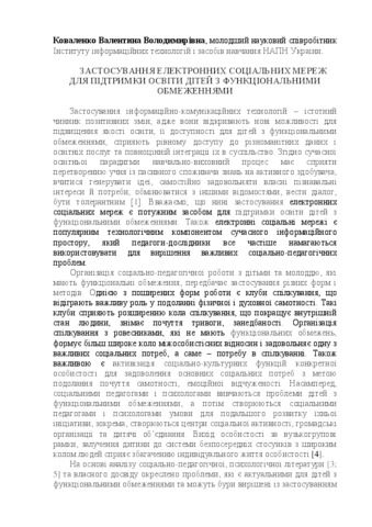 - Коваленко, В.В. (2017) The use of electronic social networks to support the education of children with functional limitations In: Матеріали науково-практичної інтернет-конференції «Інформаційні технології в освітньому процесі 2017» . ЧОІППО імені К.Д. Ушинського, м. Чернігів, Україна.