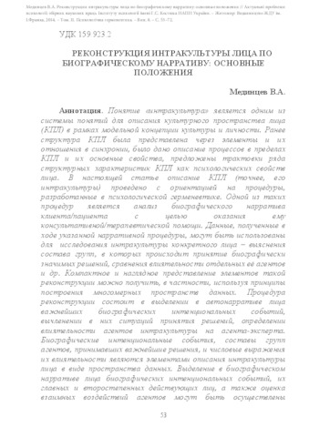 - Мєдінцев, Владислав Олександрович (orcid.org/0000-0002-5171-0139) (2014) Using biographical narrative to reconstruct person’s intraculture: basic statements Актуальні проблеми психології: збірник наукових праць Інституту психології імені Г.С. Костюка НАПН України, 8 (2). pp. 53-72. ISSN 2072–4772