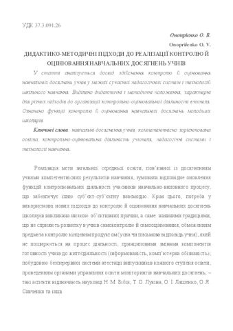 - Онопрієнко, Оксана Володимирівна (2016) Didactic and Methodological Approaches to the Realization of the Control and Assessment Activity of a Teacher Pedagogical education:theory and practice, 1 (2 (21)). pp. 150-157. ISSN 2309-9763