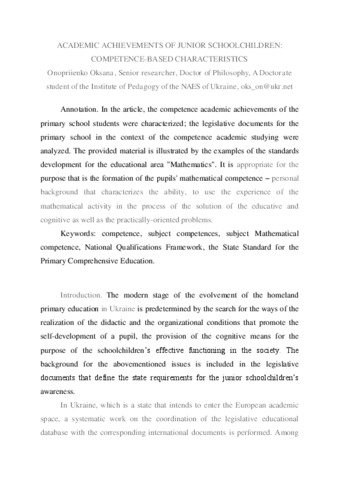 - Онопрієнко, Оксана Володимирівна (2016) Academic achievements of junior schoolchildren: competence based characteristics Social Educational Project of Improving Knowledge in Economics, 12. pp. 41-44. ISSN 2196-9531