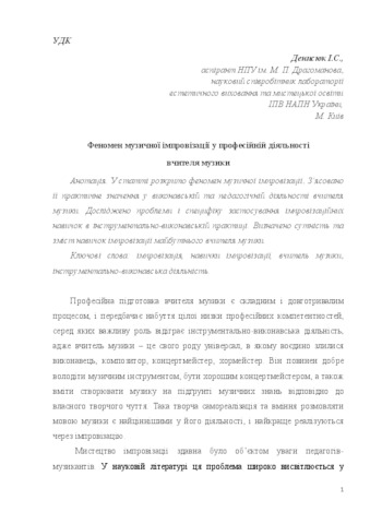 - Денисюк, І.С. (2016) The phenomenon of musical improvisation in the professional activity of the music teacher Професійна мистецька освіта і художня культура: виклики XXI століття. pp. 541-548.