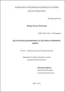 - Шпарик, Оксана Михайлівна (2012) Pedagogical ideas of Confucius in cultural and historical dimension Doctoral thesis, Інститут педагогіки.