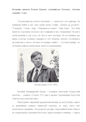 The article presents the system of tasks for the analysis of V. Bykov's story "The Alpine Ballad" "after the author" at the lessons of foreign literature in the 7th grade.
