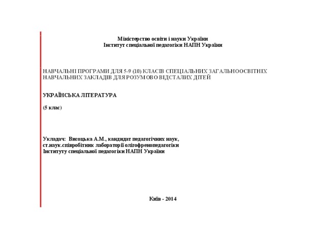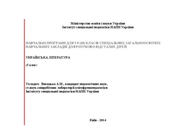 - Висоцька, А. М. (2014) Educational programs for 5-9 (10) classes of special general educational institutions for mentally retarded children: Ukrainian literature (class 5) [Teaching Resource]
