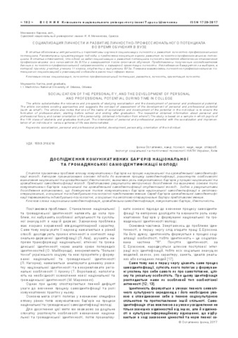 - Остапенко, Ірина Віталіївна (orcid.org/0000-0001-6710-5964) (2017) The research of communication barriers of national and civic self-identification Вісник Київського національного університету імені Тараса Шевченка, 1/2 (6/7). pp. 102-107. ISSN 1728-3817