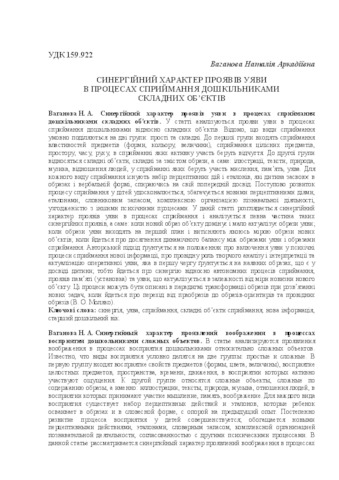- Ваганова, Н.А. (2017) The synergic character of imagination’s displays in the processes of difficult objects’ perception by preschool children Актуальні проблеми психології: Збірник наукових праць Інституту пси-хології імені Г.С. Костюка НАПН України. Т. ХІІ. Психологія творчості, 1 (23). pp. 52-60. ISSN 2072-4772