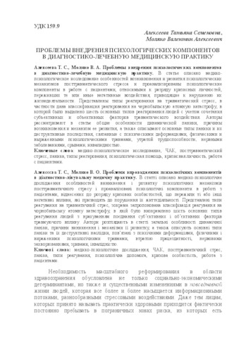 - Моляко, В.О. (2017) The problems of implementation of psychological components to the diagnostic-therapeutic medical practice Актуальні проблеми психології: Збірник наукових праць Інституту пси-хології імені Г.С. Костюка НАПН України. – Т. ХІІ. Психологія творчості, 1 (23). pp. 14-22. ISSN 2072-4772