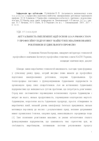- Кулалаєва, Наталя Валеріївна (orcid.org/0000-0002-8613-1495) (2017) The urgency of the implementation of the bases of lean production in the training of future skilled construction workers In: ІХ Міжнародна науково-практична конференція "Професійне становлення особистості: проблеми і перспективи" . ХНУ, м. Хмельницький, Україна, pp. 92-93. ISBN 978-966-330-301-7