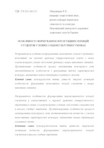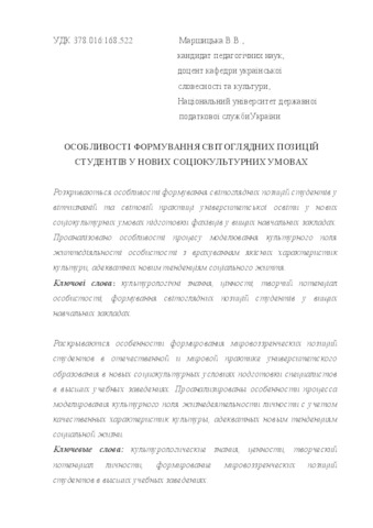 Reveals the peculiarities of formation worldview of students in the national and international practice of university education in the new socio-cultural conditions of training in higher education. The features of the modeling process of cultural fields of life of the individual, taking into account the qualitative characteristics of culture, new trends of adequate social life.