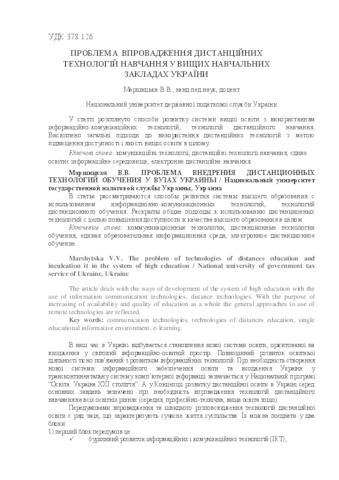 - Маршицька, В.В. (orcid.org/0000-0002-7072-8844) (2010) The problem of technologies of distances education and inculcation it in the system of high education Вісник Черкаського університету. Серія: Педагогічні науки, 4 (191). pp. 54-60. ISSN 2076-586Х