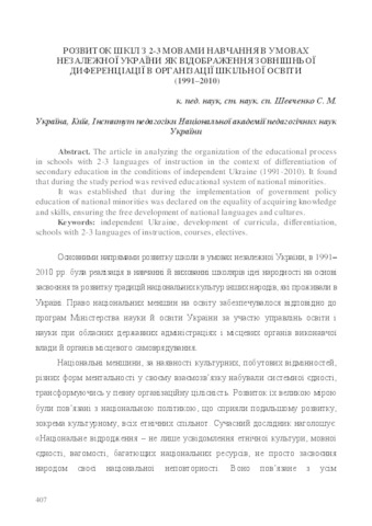 - Шевченко, Світлана Миколаївна (2017) Development of schools with 2-3 languages of instruction in the conditions of independent Ukraine as a reflection of external differentiation in the organization of school education (1991–2010) Proceedings of the III International Scientific and Practical Conference "Modern Scientific Achievements and Their Practical Application", 11 (15). pp. 42-46. ISSN 2413-1032