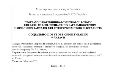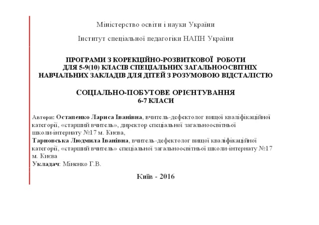 - Остапенко, Л.І., Тарновська, Л.І. and Міненко, А.В. (2016) Programs for correctional and development work for 5-9(10) classes of special general educational institutions for children with mental retardation "Social-household orientation" (classes 6-7) [Teaching Resource]