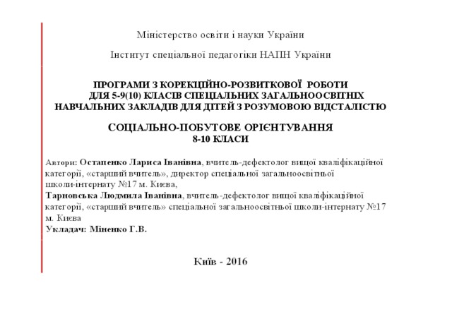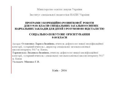 - Остапенко, Л.І., Тарновська, Л.І. and Міненко, А.В. (2016) Programs for correctional and development work for 5-9(10) classes of special general educational institutions for children with mental retardation "Social-household orientation" (classes 8-10) [Teaching Resource]