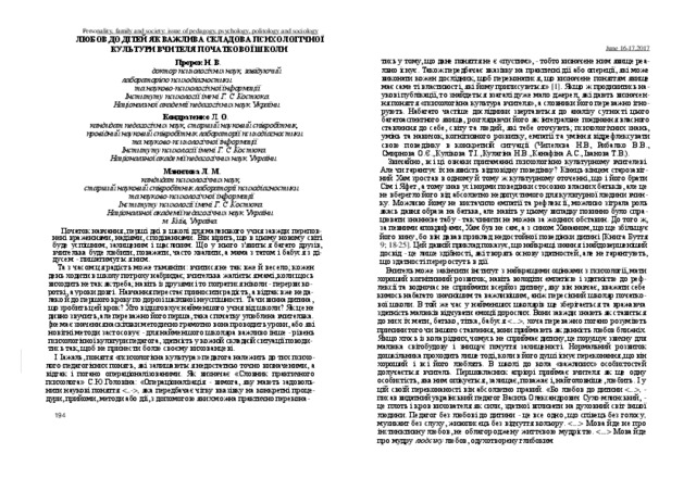 - Кондратенко, Лариса Олександрівна, Манилова, Лідія Михайлівна and Пророк, Н.В. (2017) Love for children as an important component of the psychological culture of the elementary school teacher In: International scientific-practical conference "Personality, family and society: issue of pedagogy, psychology and sociology": Conference Proceedings, June 16-17, 2017 . Шуменський університет імені Костянтина Преславського, м. Шумен, Болгарія, pp. 194-197. ISBN 978-9934-8675-4-5