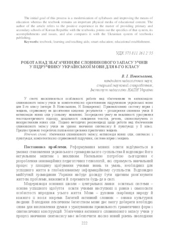 - Новосьолова, Валентина Іванівна (2017) Work on enriching the vocabulary of students in ukrainian language textbooks for 8-th form Проблеми сучасного підручника, 19. pp. 222-231. ISSN 2411-1309; ISBN 978-966-544-404-5