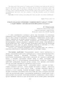 The article highlights the features of work on enriching and activating the vocabulary of students in a competently directed textbook on the Ukrainian language for the 8th form (authors V.Novoselovа, N. Bondarenko). The system of exercises and tasks aimed at achieving the final results is analyzed: the expansion of the vocabulary of students and the activation of new words in their speech. Attention is focused on the importance of taking into account the text-centric approach, the expediency of compiling texts, sentences, word combinations using new words. Methodical recommendations on the work on enriching the vocabulary of students in the lessons of syntax and punctuation in the 8th form are given. The author emphasizes the fact that the level of formation of skills to use new words in the process of creating written statements depends on the formation of skills to interpret the lexical meaning of the word; development of attention to unfamiliar words; orientation in the speech situation; definition of the sphere and function of the use of words in the text; awareness of their text-making functions; observance of lexical norms in the process of using lexical means. The theoretical positions are illustrated by examples of practical tasks.
