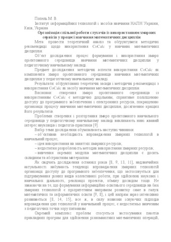 - Попель, М.В. (2017) Organization of Collaborative Work of Students With the Use of Cloud Services in The Process of Teaching Mathematical Disciplines Матеріали методологічного семінару "Нові тенденції і явища у дитячому і молодіжному середовищі в Україні: цивілізаційний, культурологічний, інформаційний виміри". ISSN 978-966-2748-95-6