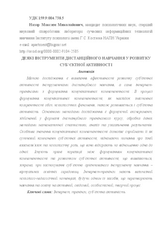 - Назар, Максим Миколайович (orcid.org/0000-0002-9104-2585) (2017) Some Tools of Distance Learning in Subjectness Activity Development Technologies of Intellect Development, 2 (7 (18)). ISSN 2223-0521