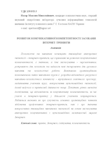 - Назар, Максим Миколайович (2017) Development of Communicative Competence by Internet-Trainings' Resources Technologies of Intellect Development, 2 (5 (16)). ISSN 2223-0521