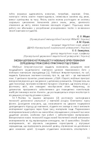 - Модло, Євгеній Олександрович, Стрюк, А.М. and Семеріков, С.О. (orcid.org/0000-0003-0789-0272) (2017) Augmented reality tools in a mobile-oriented environment of vocational training In: Професійна педагогіка і андрагогіка: актуальні питання, досягнення та інновації : матеріали Міжнародної науково-практичної конференції (м. Кривий Ріг, 20-21 листопада 2017 р.) . КДПУ, м. Кривий Ріг, Україна, pp. 31-34.