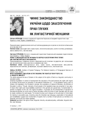 - Кульбіда, С.В. (2014) New in Ukrainian legislation as the ensuring the rights of deaf people as a linguistic minority Особлива дитина: навчання і виховання, 4 (71). pp. 39-47. ISSN 2312-2781