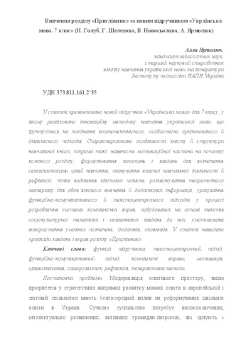 - Ярмолюк, Алла Володимирівна (2016) The Study of Section “Adverb” in the New Textbook “Ukrainian language. Grade 7” (N. Golub, G. Shelekhova, V. Novosjolova, A. Yarmoliuk) Українська мова і література в школі, 1 (124). pp. 9-13.