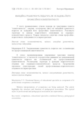 - Маршицька, В.В. (orcid.org/0000-0002-7072-8844) (2010) Emotional literacy of educational specialist as component of it professional competence considered. Вісник Запорізького національного універстету: Збірник наукових статей. Педагогічні науки, 1 (12). pp. 38-41.