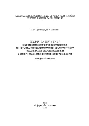 Лук'янчук, Наталія Вадимівна and Климова, Н.А. (2011) Theory and practice of training pedagogical staff for the formation of communicative competence of gifted high school students using information technology . Інформаційні системи, м. Київ, Україна. ISBN 978-966-2249-64-4