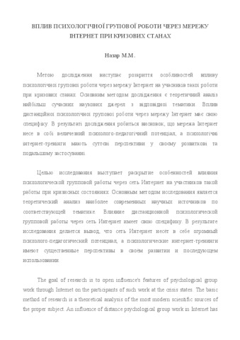 - Nazar, M.M. (2017) Influence of Psychological Group Work through Internet during the Crisis States .