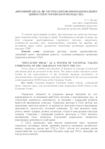 - Глушко, Оксана Зіновіївна (orcid.org/0000-0003-0101-9910) (2017) «Education ideal» as a system of national values upbringing of the Ukrainian youth in the USA Нові тенденції і явища у дитячому та молодіжному середовищі в Україні: цивілізаційний, культурологічний, інформаційний виміри. pp. 38-46. ISSN ISBN 978-966-2748-95-6