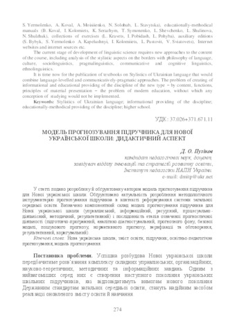 - Пузіков, Дмитро Олегович (2017) Predictive model of a textbook for the New ukrainian school: didactic aspect Проблеми сучасного підручника, 2 (19). pp. 274-284. ISSN 2411-1309