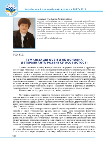 - Онищук, Людмила Анатоліївна (orcid.org/0000-0002-7854-9314) (2017) Humanization of education as a basis of determinants of personality development Український педагогічний журнал, 3 (11). pp. 102-108. ISSN 2411-7420