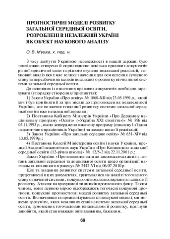 - Мушка, О.В. (2016) Prognostic models of the development of general secondary education, developed in independent Ukraine as an object of scientific analysis In: Анотовані результати науково-дослідної роботи Інституту педагогіки НАПН України за 2016 рік . Інститут педагогіки НАПН України, м. Київ, Україна, pp. 69-70. ISBN 978-966-644-398-5
