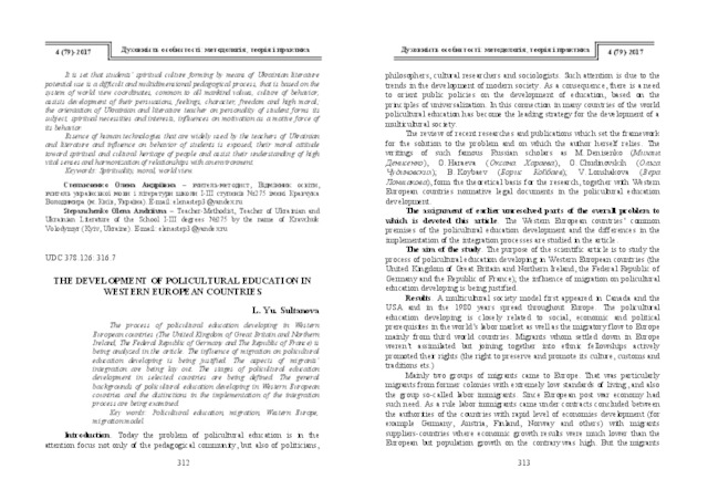 - Sultanova, Leila (orcid.org/0000-0002-3324-6926) (2017) The development of policultural education in Western European countries Духовність особистості: методологія, теорія і практика, 4 (79). pp. 312-322. ISSN 2220-6310