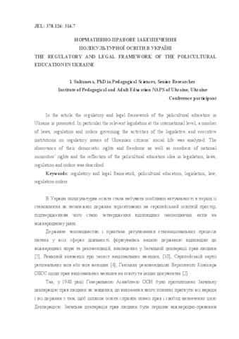 In the article the regulatory and legal framework of the policultural education in Ukraine is presented. In particular the relevant legislation at the international level, a number of laws, regulation and orders governing the activities of the legislative and executive institutions on regulatory issues of Ukrainian citizens’ social life was analyzed. The observance of their democratic rights and freedoms as well as members of national minorities’ rights and the reflection of the policultural education idea in legislation, laws, regulation and orders was described.
