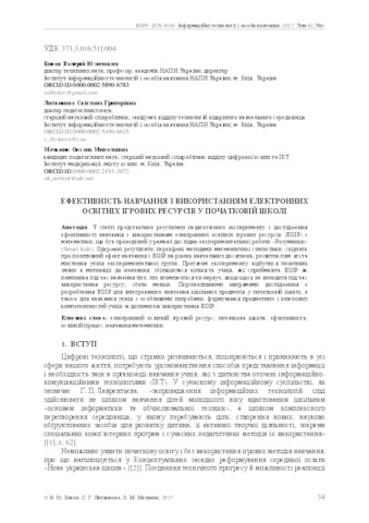 - Литвинова, С.Г. (orcid.org/0000-0002-5450-6635), Биков, В.Ю. (orcid.org/0000-0002-5890-6783) and Мельник, Оксана Миколаївна (orcid.org/0000-0002-2193-2072) (2017) Effectiveness of education with electronic educational game resources in primary school Інформаційні технології і засоби навчання, 6 (62). pp. 34-46. ISSN 2076-8184