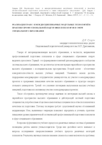 - Супрун, Д. М. (orcid.org/0000-0003-4725-094X) (2017) The implementation of trans- and interdisciplinary modular technologies in the practice of professional training of psychologists in the field of special education Когнитивные штудии: символьный, модульный и нейросетевой подходы: материалы VII междунар. междисциплин. конф., 7. pp. 252-258.