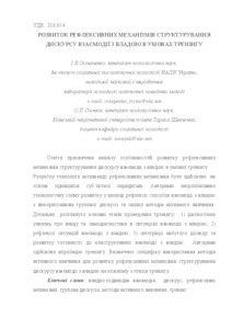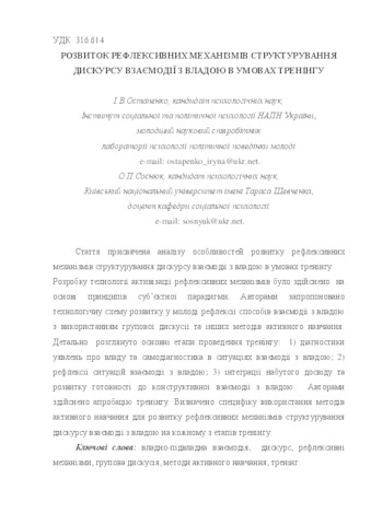 - Остапенко, Ірина Віталіївна (orcid.org/0000-0001-6710-5964) and Соснюк, Олег Петрович (orcid.org/0000-0002-7558-8879) (2015) Reflexive mechanisms’ of development of discourse structuring of power-dependent interaction with the authorities in training Психологічні науки: проблеми і здобутки, 2 (8). pp. 185-201.