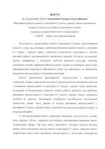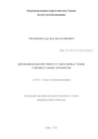 The dissertation is dedicated to the problem of education of persistence in schoolchildren of 6–7 years old during trainings of Horting. The thesis analyses the state of research of the problem of persistence education in psychological and pedagogical literature as well as specifies the essence of the concept "education of persistence in primary school children in the course of Horting". During the research, we examined the experience of public schools in education of persistence in children of 6–7 years old by means of Horting trainings, and provided new ways of sports activities organization through implementation of the course of Horting. We have also determined criteria, indicators and levels of persistence development in primary school children. We have elaborated the pedagogical conditions, contents, forms and methods of education of persistence in schoolchildren of 6–7 years old by means of Horting trainings implemented in public schools and experimentally verified their effectiveness.