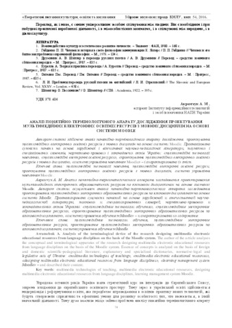 - Аврамчук, Антон Миколайович (orcid.org/0000-0002-2868-0541) (2016) Analysis of the terminological device of the research designing multimedia electronic educational resources from language disciplines on the basis of the Moodle system Теоретичні питання культури, освіти та виховання, 54. pp. 74-78. ISSN 2411-5983