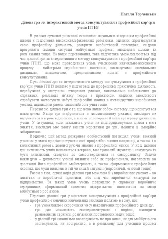 - Торчевська, Наталія Вікторівна (2017) A business game as interactive method of advising is from the professional career of students of vocational schools In: Професійне становлення особистості: проблеми і перспективи: тези доп. IX міжнар. наук.-практ. конференції (м. Хмельницький, 9-10 листоп. 2017 р.) . Хмельницький національний університет, м. Хмельницький, Україна, pp. 103-104.