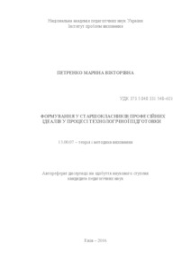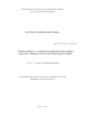 - Петренко, М.В. (2016) Formation of Professional Ideals of High Schoolchildren in the Process of Technological Training Dissertation candidate2 thesis, Інститут проблем виховання.