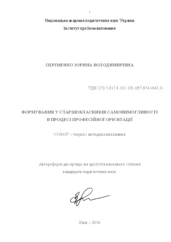 - Охріменко, З.В. (orcid.org/0000-0001-7217-100X) (2016) Formation of Senior Pupils’ Self-Exactingness in the Process of Vocational Guidance Dissertation candidate2 thesis, Інститут проблем виховання.